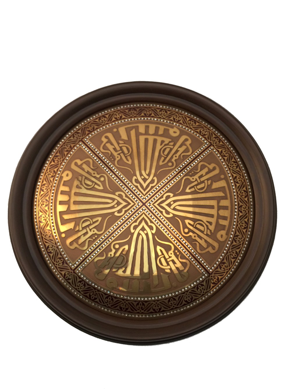Brown بني, Gold المذهبات, Othmani العثمانية, Plates صحون, الخشبيات Kufi Basmalah Tablo تابلو البسملة بالخط الكوفي Posted by magmaadmin on 8 October,201631 August,2017 Handcrafted wooden tablo with four Kufi repeated basmallahs. Tablo is decorated with 24 carat gold gliding. Diameter: 40 cm. تابلو من الخشب مصنع يدويا ومنقوش عليه رسم البسملة أربع مرات بالخط الكوفي مزين بالذهب ذو الـ 24 قيراط وقطره 40 سم.